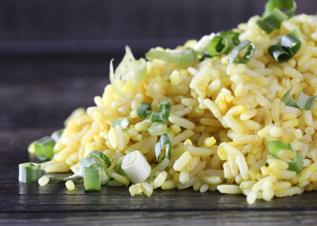 Parboiled Rice cooked in Vegetable base, garnished with green onions