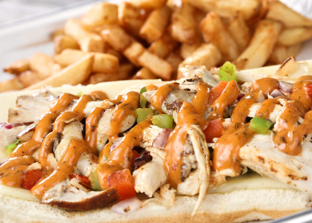 Pulled Chicken, Cheese sliced, red onions, red and green peppers, chipotle aioli sauce, served on a hoagie bun.