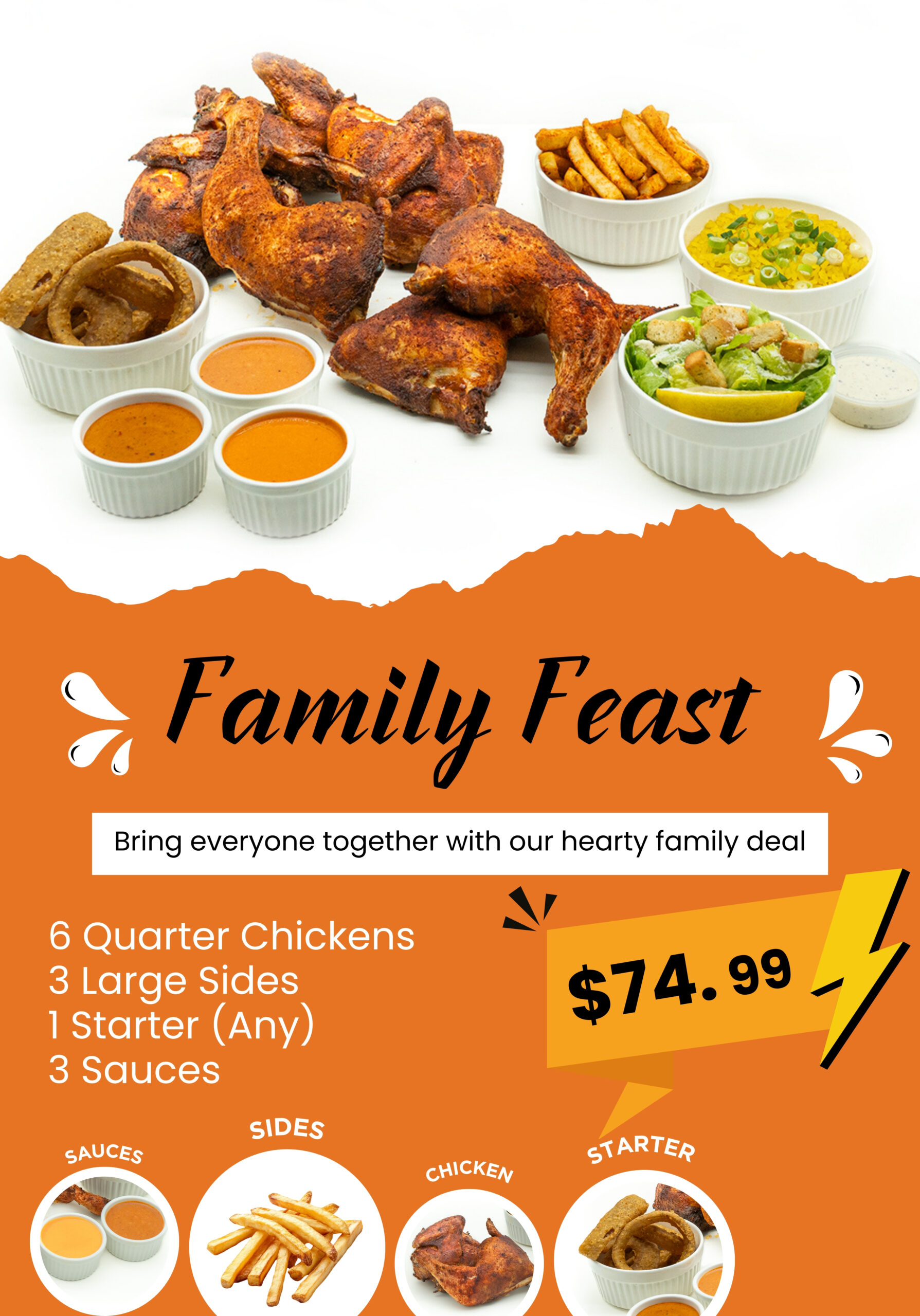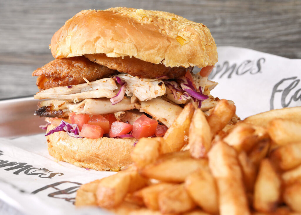 Pulled chicken, red cabbage, tomatoes, red onion ring, Flamos Peri Peri mild or Hot Sauce, served on a brioche bun.