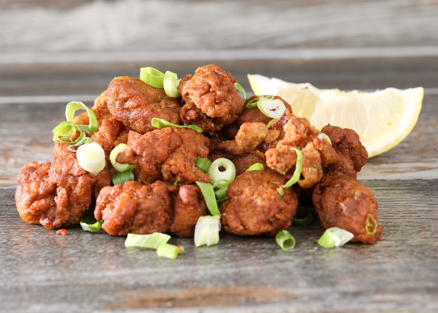 Homemade battered chicken pieces, served with one choice of sauce on the side, a lemon wedge and garnished with green onions.