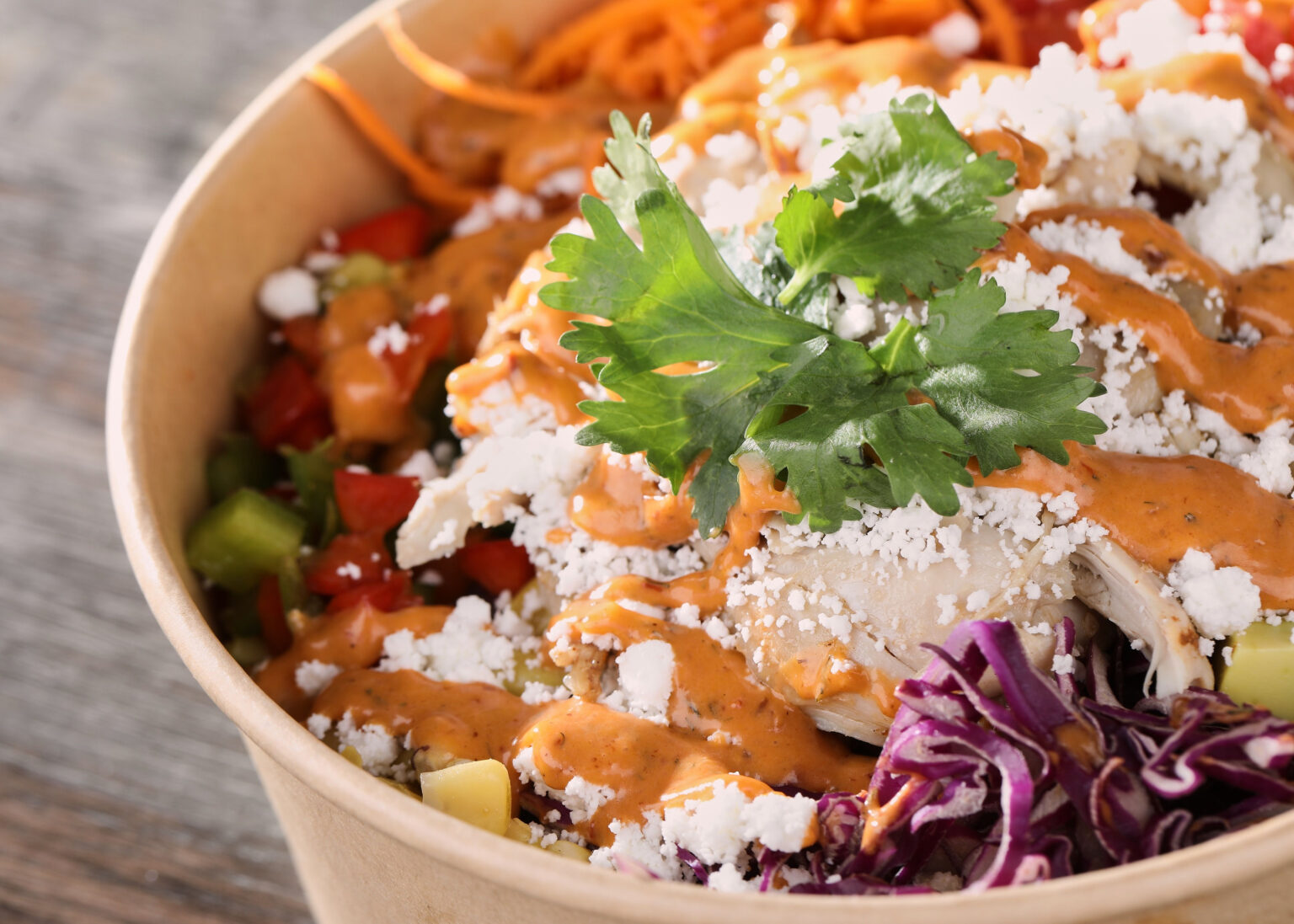 Pulled chicken, avocado, crumbled feta cheese, black beans, corn, red and green peppers, red cabbage, carrots, tomatoes, cilantro, served on a bed of quinoa or saffron rice, topped with chipotle aïoli sauce.