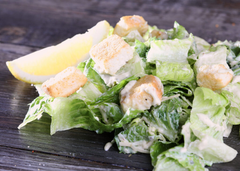 Romaine Lettuce, parmesan cheese, garlic croutons, lemon wedge and Caesar dressing on