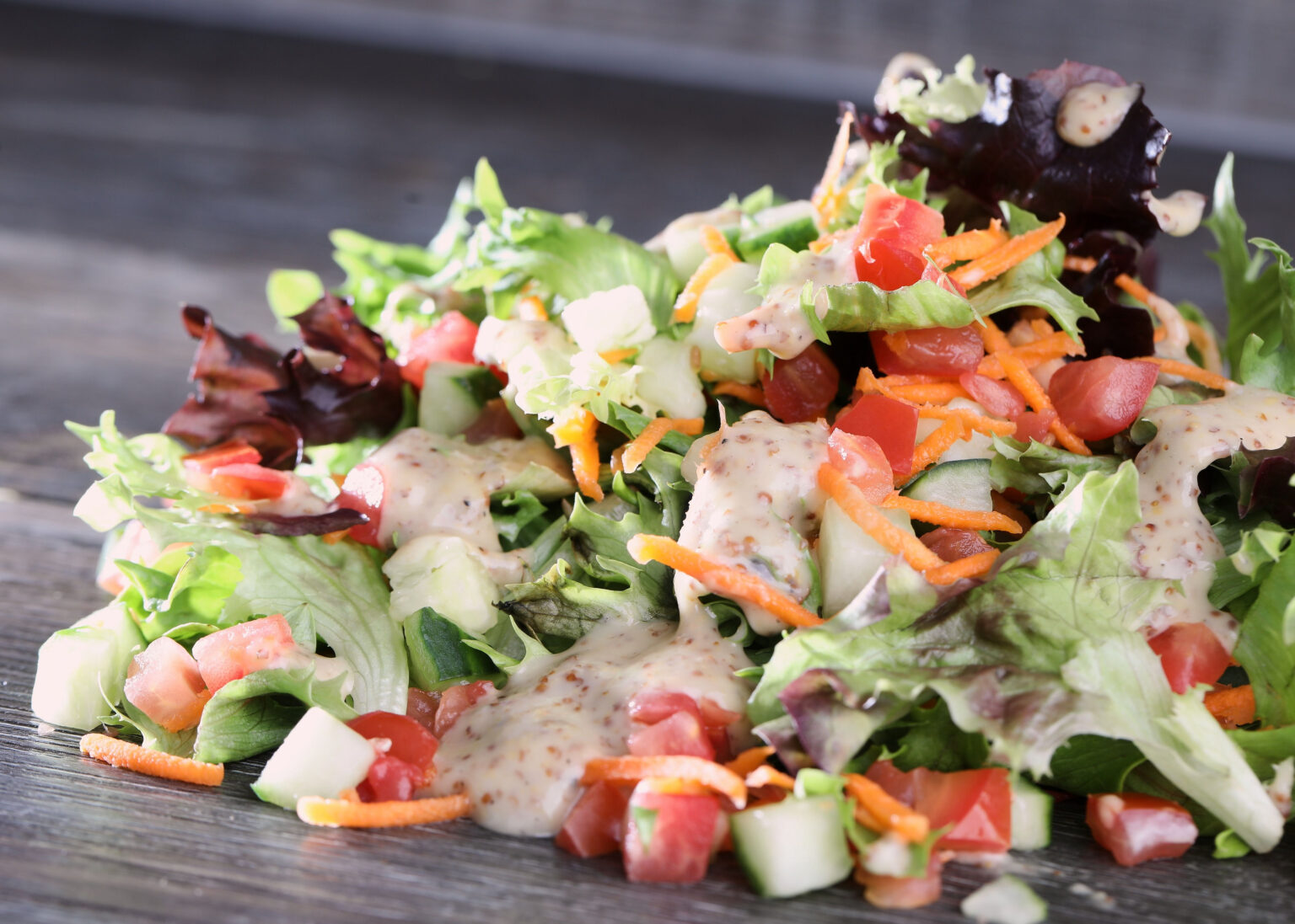 Romaine Lettuce, carrots, cucumbers, tomatoes and Italian dressing on the side.