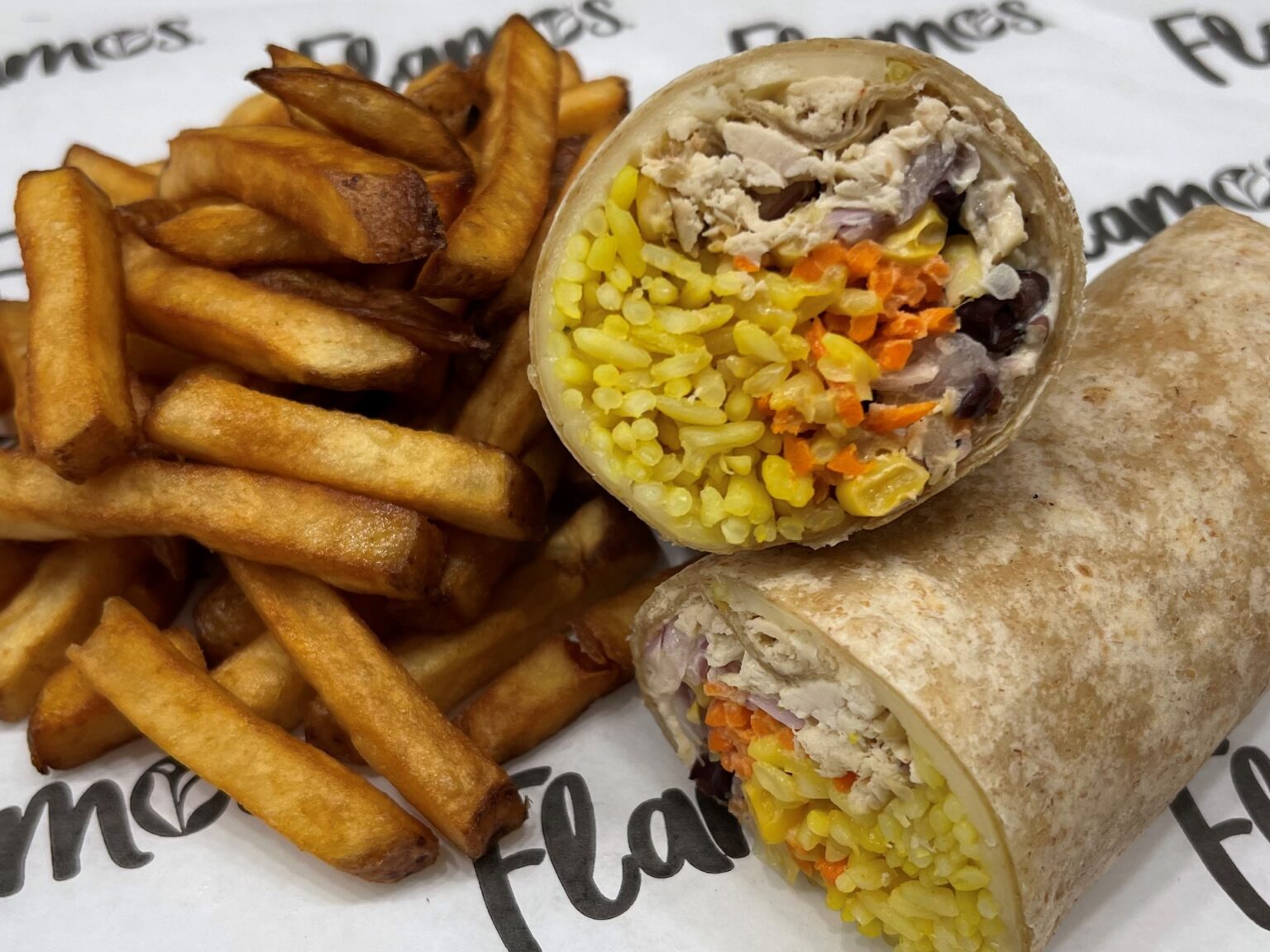 Pulled chicken, cheese sliced, black beans, corn, carrots, red onions, saffron rice, jalapeño ranch sauce, served on a whole wheat tortilla.