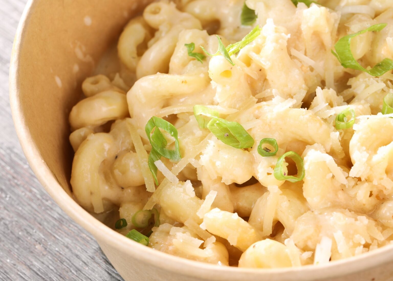 Cavatappi pasta, Canadian cheddar cheese, mozzarella cheese, Parmesan cheese, green onions.