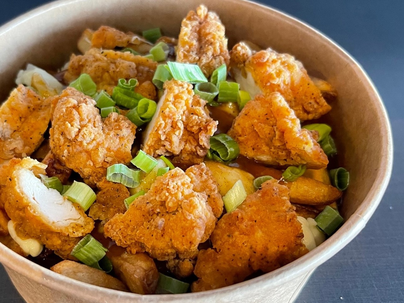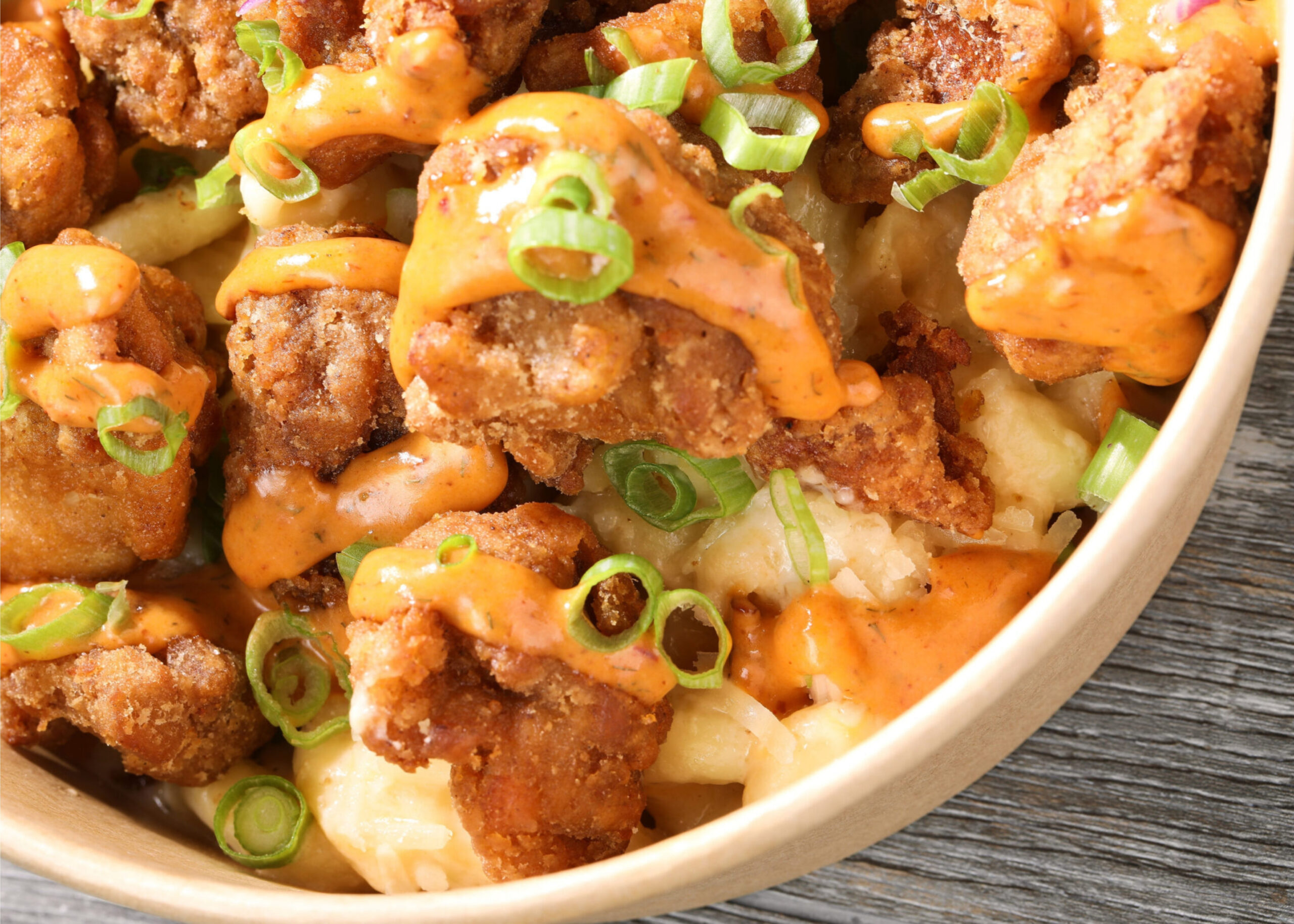 Karaage popcorn chicken, Cavatappi pasta, Canadian cheddar cheese, mozzarella cheese, Parmesan cheese, green onions topped with chipotle aioli sauce.