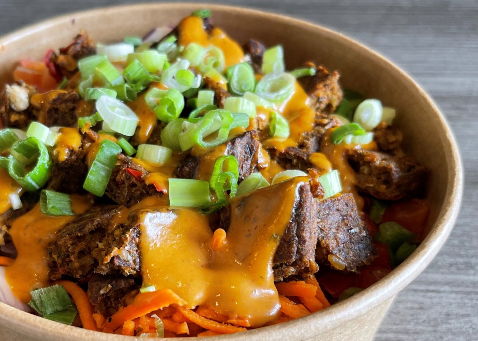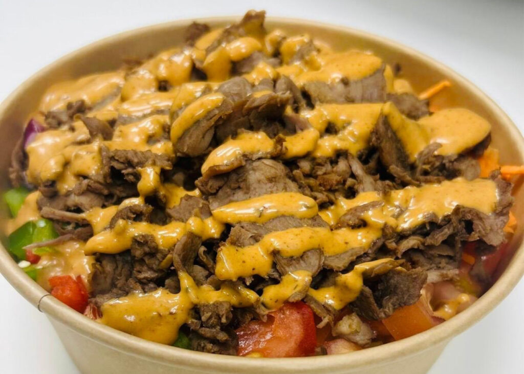 Shredded steak, red & green peppers, cucumbers, tomatoes, red onions, carrots, served on a bed of saffron rice or quinoa, topped with chipotle aïoli sauce.
