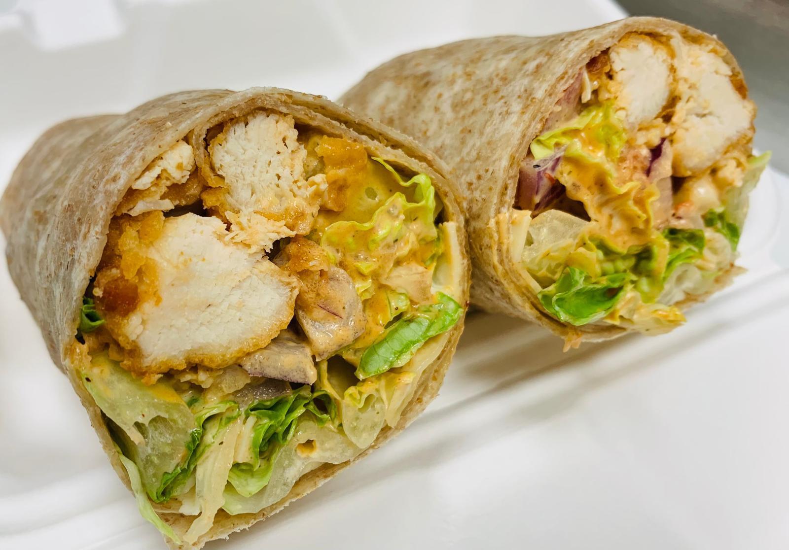 Homemade battered chicken tenders, cheese sliced, romaine lettuce, red onions, tomatoes, chipotle aioli and jalapeño ranch sauce, served on a whole wheat tortilla.