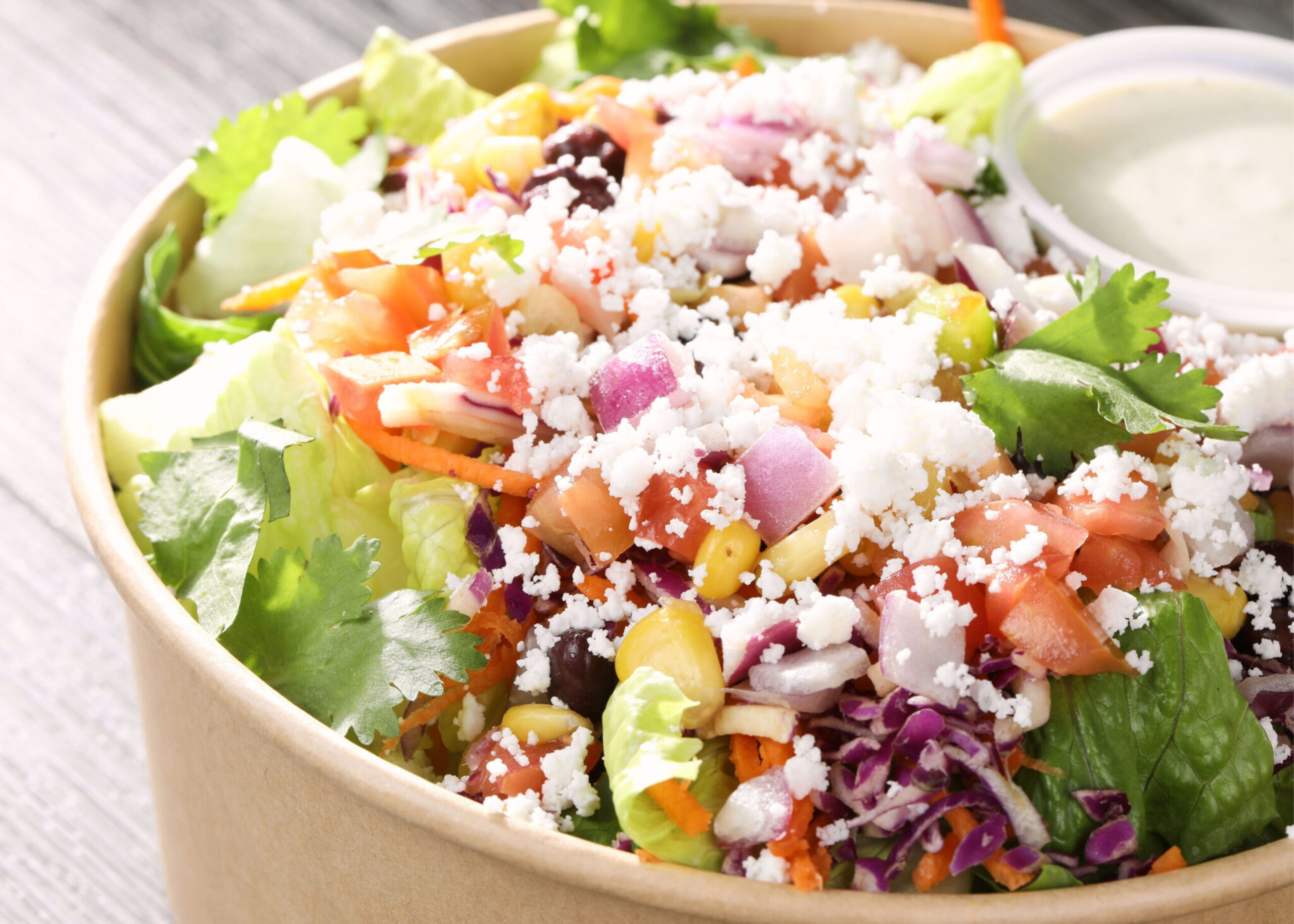 Romaine lettuce, red cabbage shredded, carrots shredded, red onions diced, corn and beans mix, tomatoes diced, jalapenos, crumbled feta cheese, cilantro, served with jalapeno ranch dressing