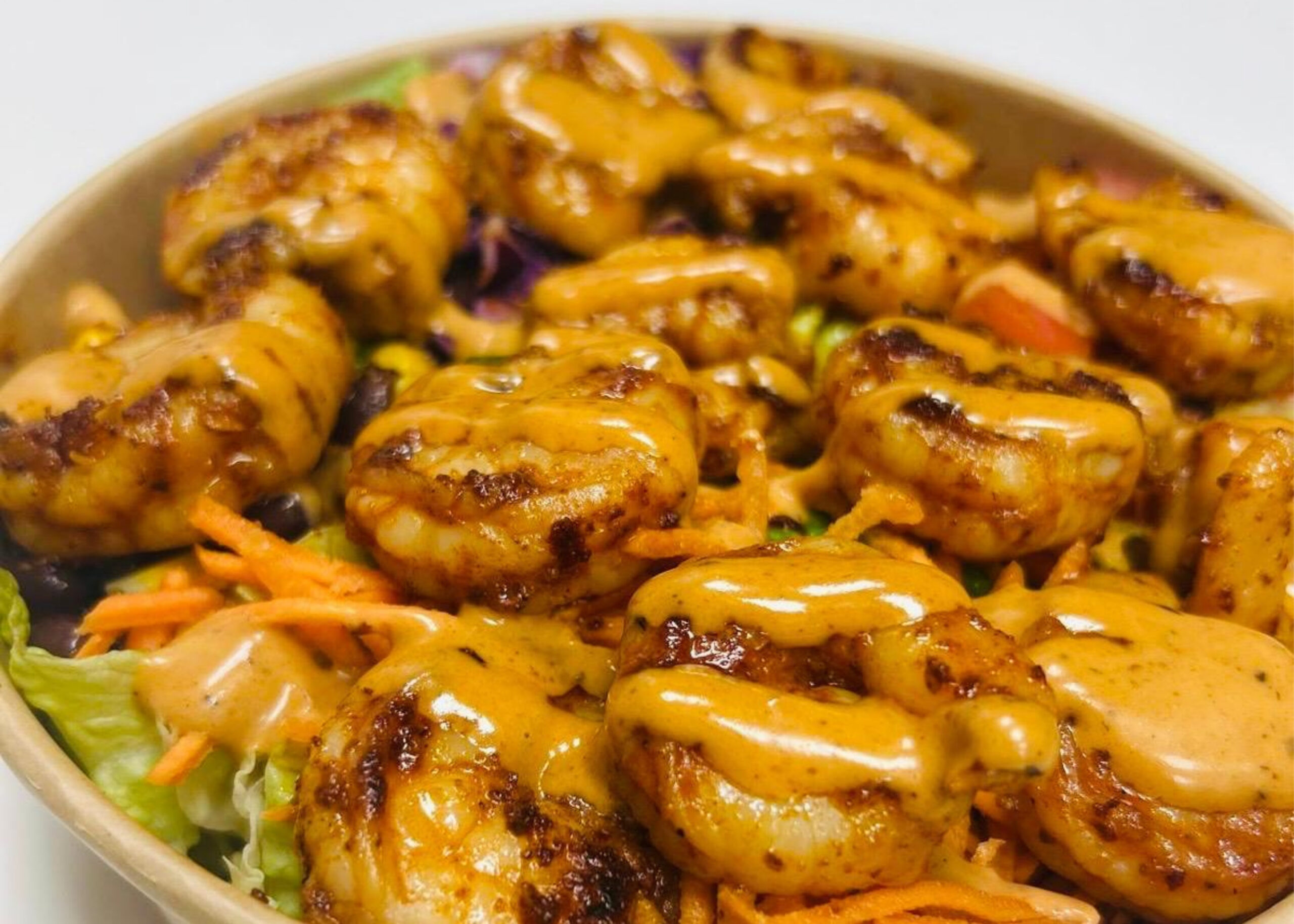 Grilled shrimp, green & red peppers, carrots, tomatoes, red cabbage, corn & black beans, served on a bed of saffron rice or quinoa, topped with chipotle aïoli sauce.
