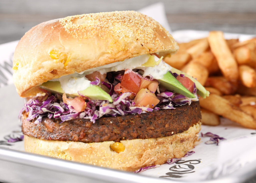 Black bean & corn burger, avocado, tomatoes, romaine lettuce, red cabbage, chipotle aioli on a brioche bun.