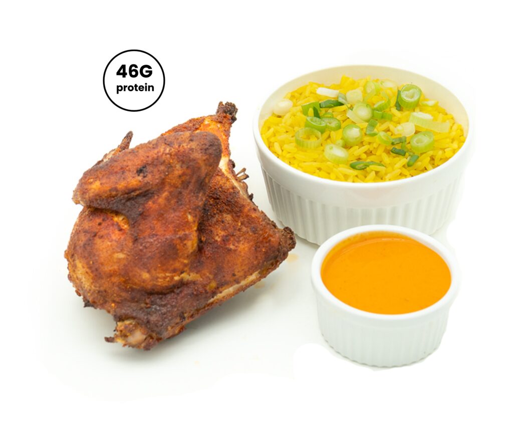 Grilled chicken, butter chicken gravy, cilantro, served on a bed of white rice.